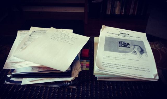 Here's my (main) piles of research for essays I want/need to write. They are starting to get out of hand. As you can see, I still need printed pages for my writing process. Double-sided printing for the environment's sake.